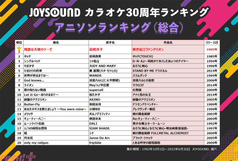 カラオケ30周年ランキングの頂点を掴んだのは、テレビアニメ『新世紀エヴァンゲリオン』の放送開始から27年経った今もなお歌い継がれるヒットソング、高橋洋子さんの『残酷な天使のテーゼ』。