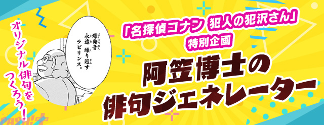 “阿笠博士の俳句ジェネレーター”は、『名探偵コナン 犯人の犯沢さん』の特別企画。キャンペーン期間中に『名探偵コナン公式アプリ』の“阿笠博士の俳句ジェネレーター”でオリジナルの俳句を詠んでみましょう! できた俳句はTwitterでツイートできます。