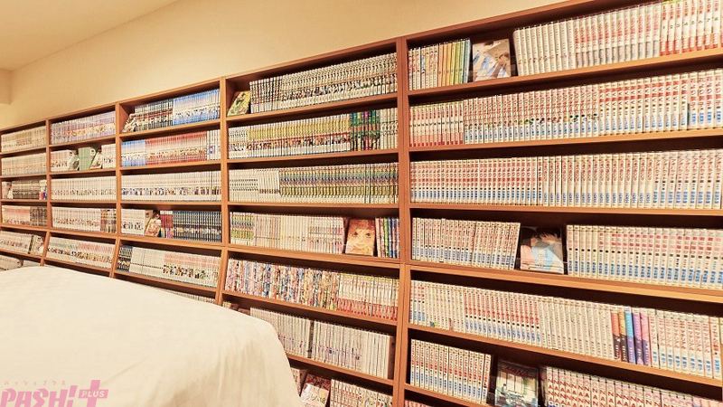 お部屋に設置された本棚には、ホテルの客室内設置数では国内最大規模数を誇る約120タイトル、3,000冊の漫画本を常時用意。最新刊の導入や作品の入れ替えは定期的に行われます。