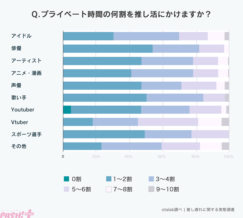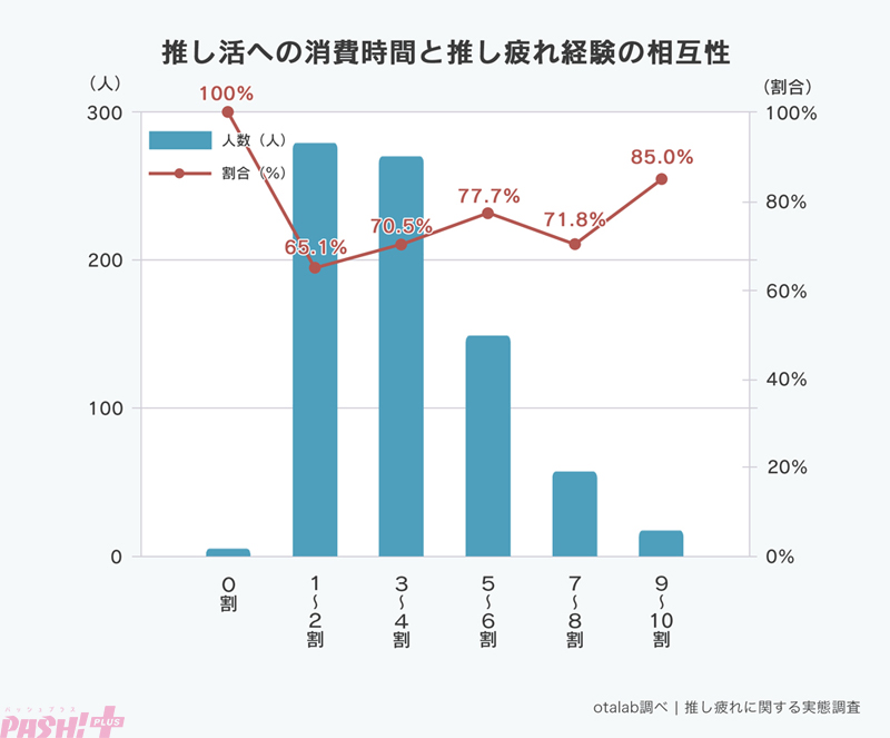 プライベート時間の“9~10割”を推し活に掛けている人は85%の人が推し疲れを感じており、消費時間が“1~2割”の人とは約20%もの差が見られた。