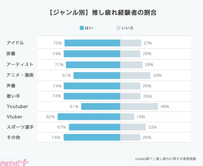 また、同じく動画の投稿を活動の主としている“Youtuber”では“推し疲れ”経験が50.8%と、回答ジャンルの中で最も“推し疲れ”経験が少ない結果となった。