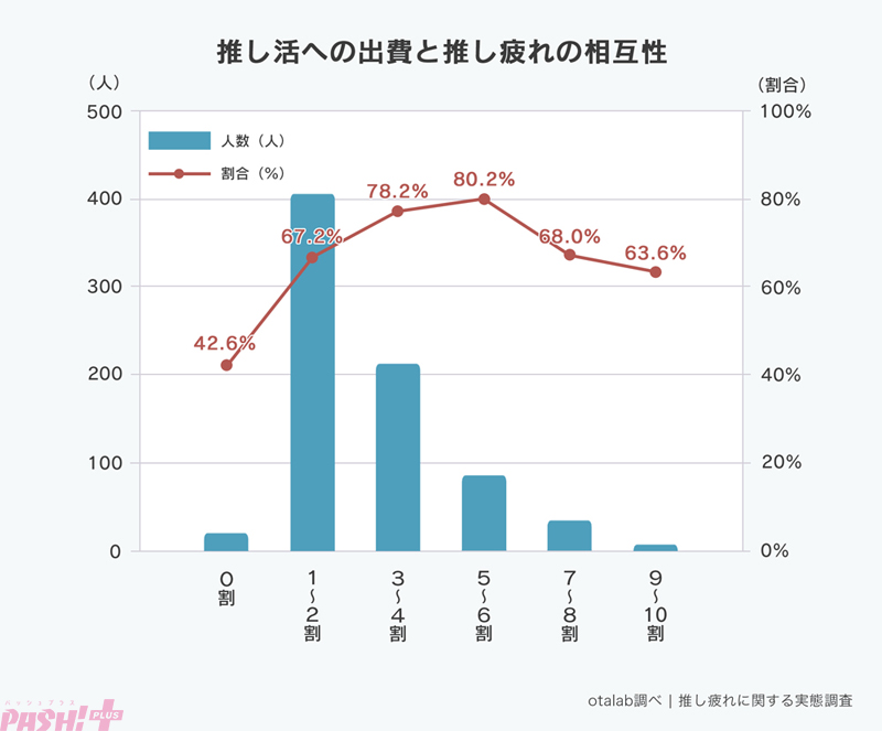驚いたのは、自由に使えるお金の“9~10割”を推し活に掛けている人の推し疲れの割合は、出費が“0割”の人の次に低いということだ。