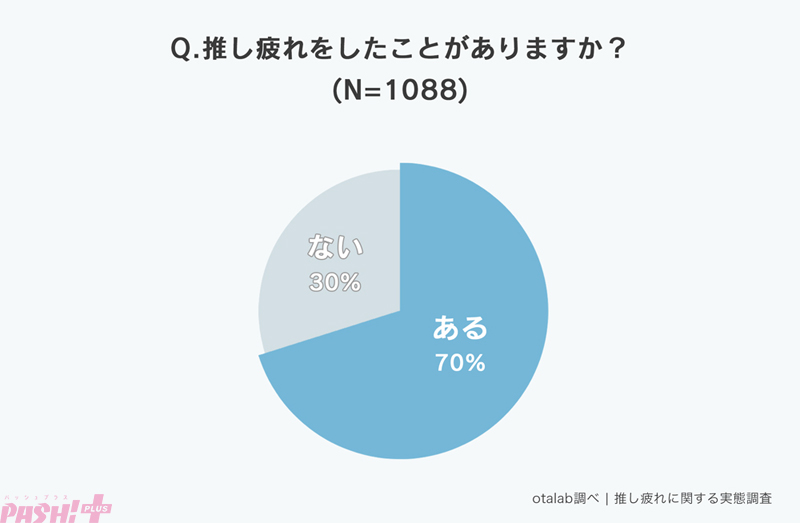まずは推し疲れについての実態を調査すべく、10代~60代の推し活女子に推し疲れ経験があるかどうかの質問を行った。調査の結果、推し活女子の7割以上が“推し疲れの経験がある”という結果となった。