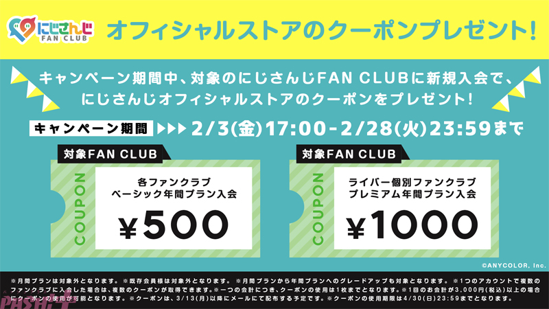 1,000円クーポン:期間中に対象ファンクラブのプレミアム年間プランに新規入会、もしくはグレードアップした会員