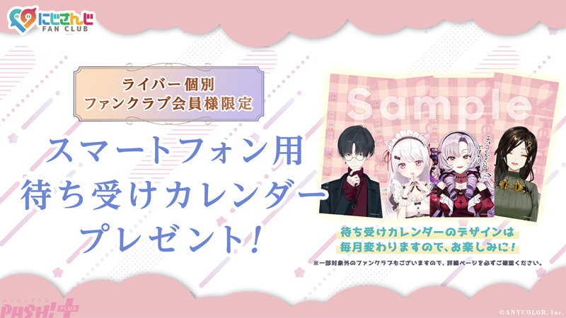 個別ライバーファンクラブ会員様限定の、スマートフォン用待ち受けカレンダー画像をプレゼント開始。毎月異なるデザインの待ち受けカレンダー画像となりますので、お楽しみに!