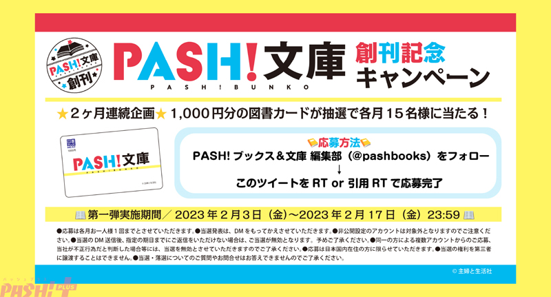 SNSを中心にプレゼントキャンペーンも連続開催。第1弾はPASH!BOOKS&文庫編集部Twitterをフォローして、キャンペーンツイートをリツイートをするだけで抽選で1000円分の図書カードNEXTが当たります。創刊を記念した“PASH!文庫”オリジナルデザインの図書カードにも注目です。
