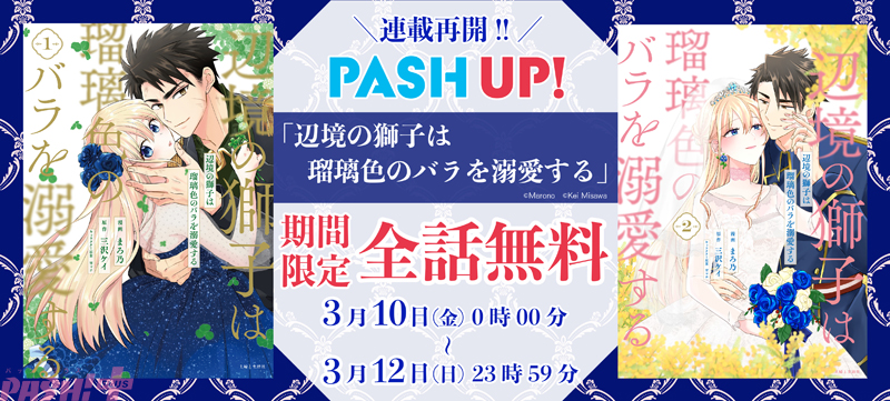 主婦と生活社が運営するマンガ・ラノベ・雑誌が集結したエンタメサイト“PASH UP!”で連載中のマンガ『辺境の獅子は瑠璃色のバラを溺愛する』の連載再開が決定。これを記念して、本日より3月12日23:59までの期間1~22話の一挙無料公開が行われます。