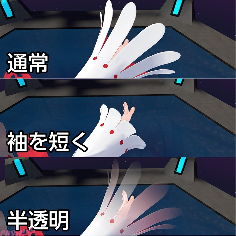 VRChat上でアクションメニューを操作することによって、袖と脚部の衣装の着脱が可能な他、手元が見えやすいよう広がった袖部分を短くしたり、半透明にすることが可能です。