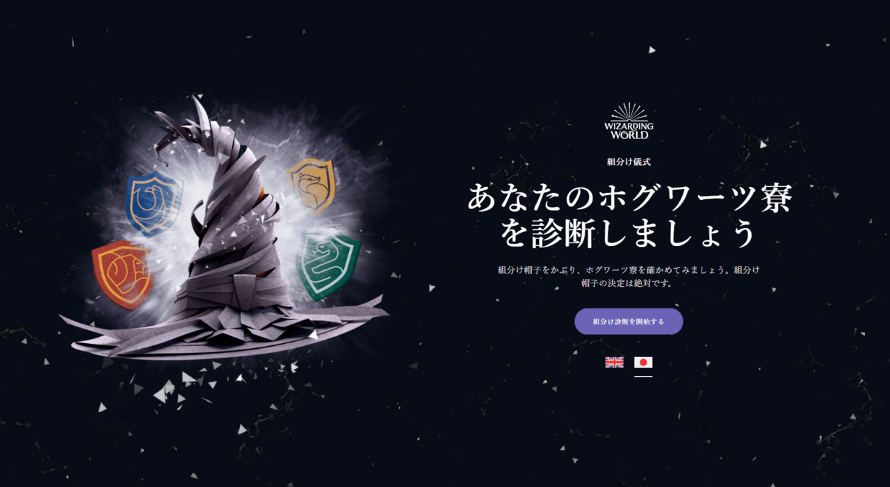 映画『ハリー・ポッター』に登場する、ホグワーツ魔法魔術学校の4つの寮の中から、魔法の帽子「組分け帽子」がユーザーの適性に応じて所属する寮を診断してくれる現行の「公式ホグワーツ組分け帽子診断」サイトは、2019年に英語版の『ハリー・ポッター』魔法ワールド公式サイトで開始されました。