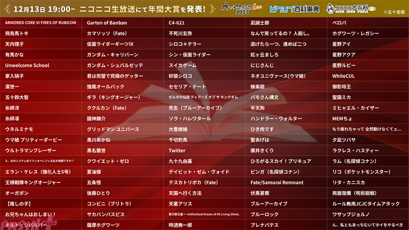 ゲームでは、ファン待望の10年ぶりのシリーズ最新作として話題となった『ARMORED CORE VI FIRES OF RUBICON』や、発売からわずか3日でソフト売上1,000万本突破という記録を打ち立てた『ゼルダの伝説 ティアーズ オブ ザ キングダム』からは作品タイトルに加えてゲーム内のセリフがミーム化した「もう疲れちゃって 全然動けなくてェ…」もノミネート。