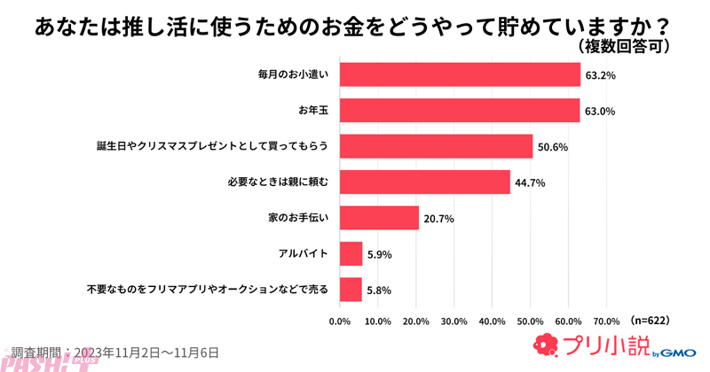過半数が「毎月のお小遣い」(63.2%)、「お年玉」(63.0%)と回答しました。定期的にもらうお金や年に1度の収入などで推し活費用をやりくりしているようです。