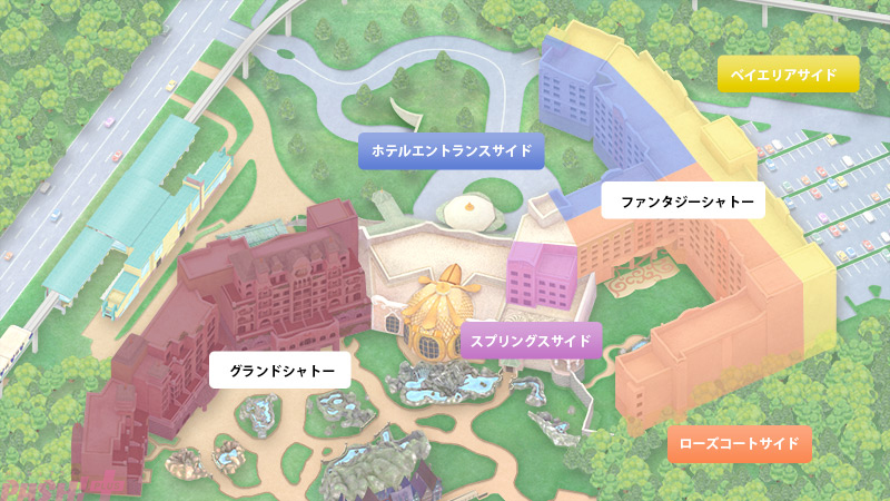また、客室は位置(サイド)によってベイエリアサイド、ホテルエントランスサイド、ローズコートサイド、スプリングス