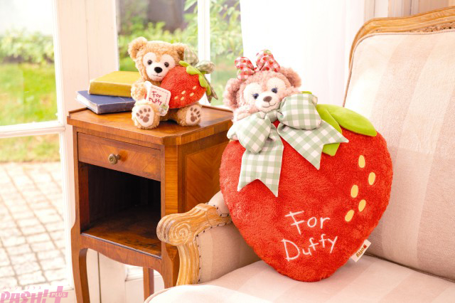 「ダッフィー&フレンズのハートフェルト・ストロベリーギフト」のストーリーをイメージしたグッズとして、ダッフィーにプレゼントするいちごのブローチにシェリーメイがリボンを結んでいる様子を表現したクッションや、みんなが作ってくれたいちごのブローチをもらってよろこんでいるダッフィーのぬいぐるみが登場します。