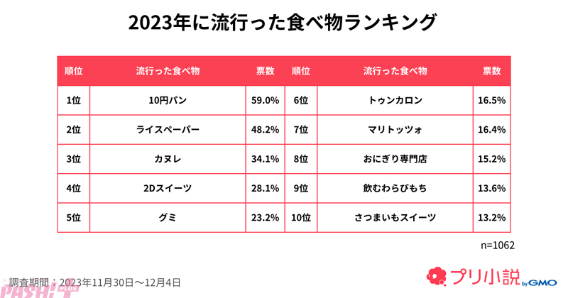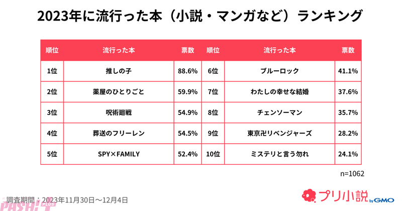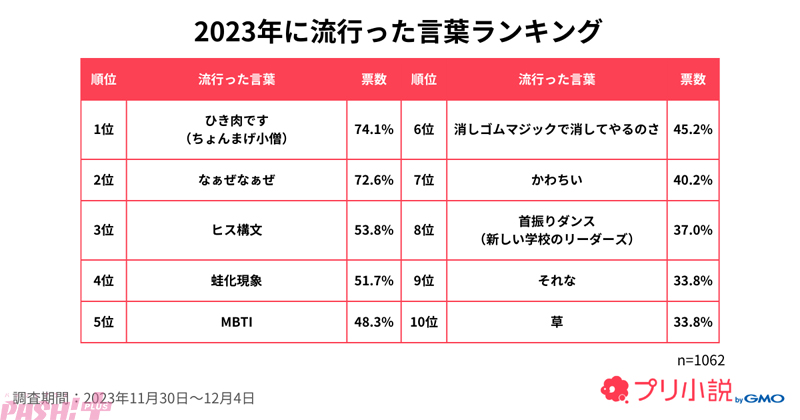 GMOインターネットグループのGMOメディアは、運営するチャット型小説サービス「プリ小説 byGMO」のユーザーを対象に「2023年のトレンド」に関するアンケートを実施。もっとも多い割合を占める女子中高生1,062名のアンケート結果をランキング形式で公開しました。