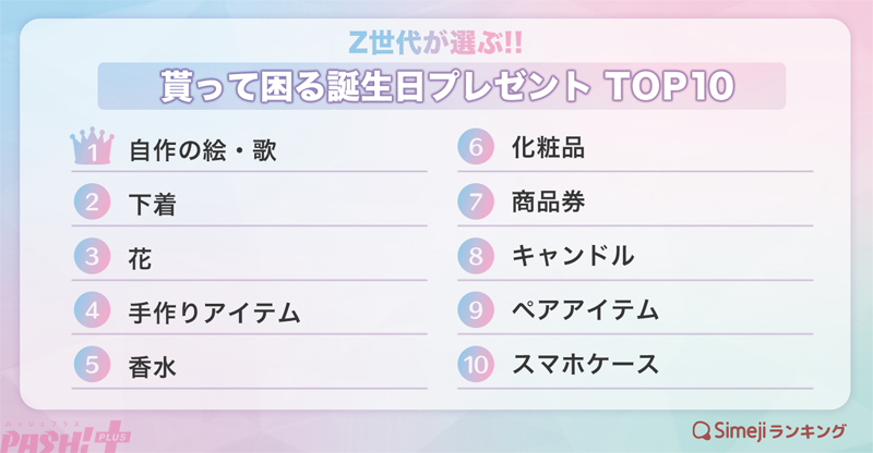 バイドゥが提供するきせかえ顔文字キーボードアプリ「Simeji」は、Simejiユーザーへアプリ上でアンケート調査を実施。“Z世代が選ぶ!!「貰って困る誕生日プレゼントTOP10」”を発表しました。