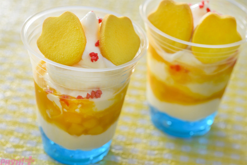 パスタはフェットチーネ・カルボナーラにビーフミートソースとドナルドらしいユニークな青いチーズがトッピングされ、ドナルドの足としっぽをイメージしたタマゴが添えられています。ドナルドの形のチョコレートが乗ったデザートのレアチーズムースケーキには、パイナップルジャムが入っており甘酸っぱく爽やかな味わいです。また、「プラザパビリオン・レストラン」限定のスーベニアコースター付きのスパークリングゼリードリンクも登場します。