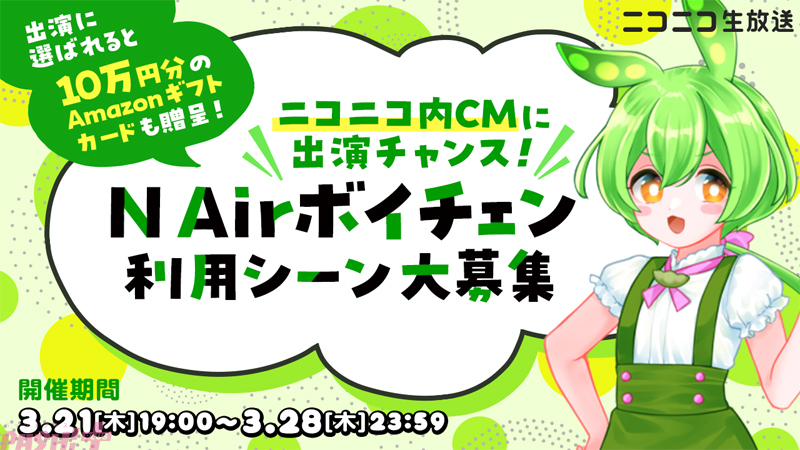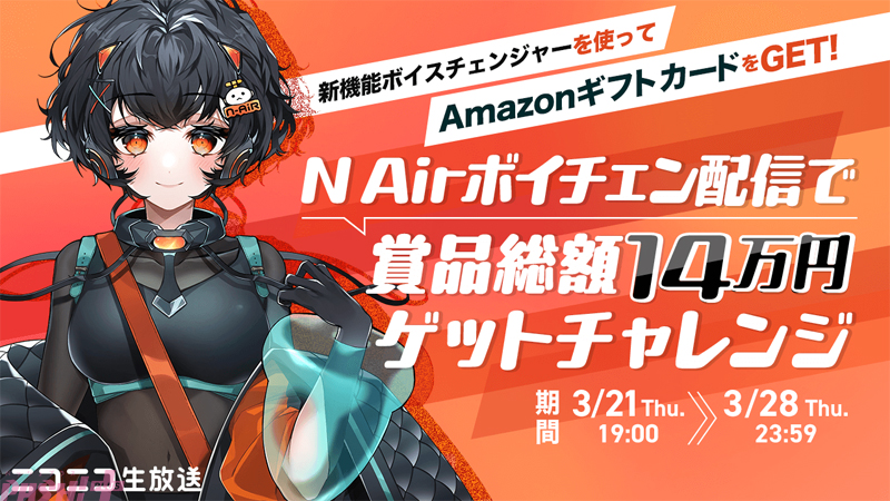 「N Airボイスチェンジャー」機能のリリースを記念して、3月21日(木)~3月28日(木)の一週間にわたり、賞品総額14万円分のAmazonギフトカードがあたる配信応援キャンペーンおよびニコニコ内CMへの出演権や10万円分のAmazonギフトカードがあたるN Airボイスチェンジャー利用シーン募集キャンペーンが開催されます。