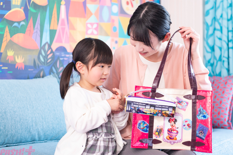 オリジナルトートバッグには、ホテルとパークの間を運行し、子どもをはじめ、宿泊ゲストに親しまれているシャトルバス「ウィッシュ&ディスカバー・シャトル」をデザインしたオリジナルポーチが付いています。パークでめいっぱい遊んだ楽しい気持ちを思い起こさせてくれます。