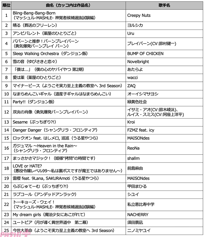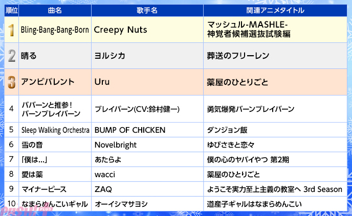 第3位は、中世の東洋を舞台に毒味役の少女が宮中で起こる難事件を次々に解決する『薬屋のひとりごと』のOPテーマ・Uruの「アンビバレント」です。アニメの世界観に寄り添って書き下ろされたエンディングテーマ(EDテーマ)・wacci「愛は薬」は8位となりました。