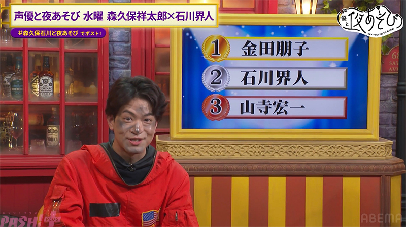 「1位・金田朋子、2位・石川界人、3位・山寺宏一」となるランキングを妄想しろというお題に、石川さんは「こんなことするな! 架空でも山寺さんの上に立たせるな!」とクレーム。しかし、楽しそうな森久保さんからは「界人が山寺さんに勝ってることってなんだい?」と意地悪な質問が飛び出し、石川さんは頭を抱えます。