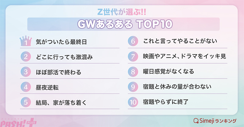 Z世代のユーザーへSimejiアプリ上でアンケートを実施し、その調査結果をランキング化。今回のテーマは「Z世代が選ぶ!!「GWあるある」」です。