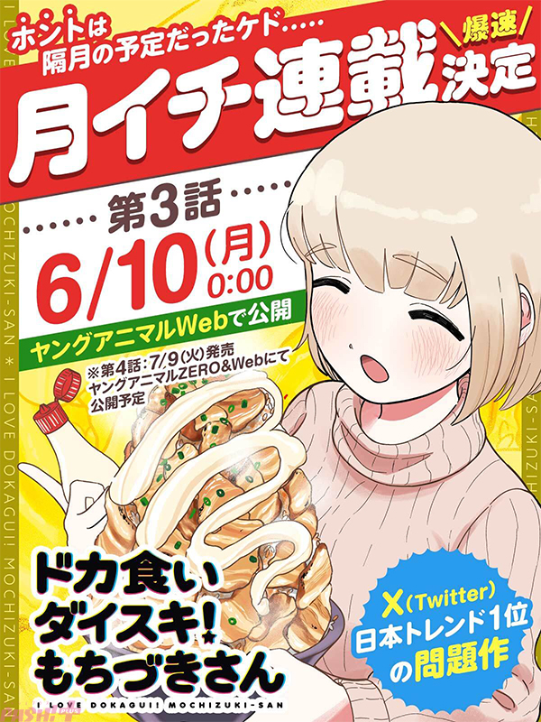 まるよのかもめさんによる話題沸騰中の禁断グルメギャグ『ドカ食いダイスキ!もちづきさん』第3話が6月10日に公開決定。さらに、大反響につき月イチ連載も決定しました。
