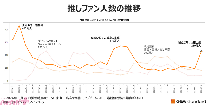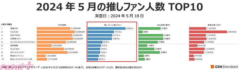 2024年5月の「推しファン人数TOP10」では、『鬼滅の刃』が「推しファン人数」を前月より+137万人と大きく値を伸ばし、230万人を記録。2位の『YouTube』(161万人)に大差をつけて1位を獲得しました。5月12日に始まった「柱稽古編」のアニメ放送でファン熱が再燃したものと考えられます。