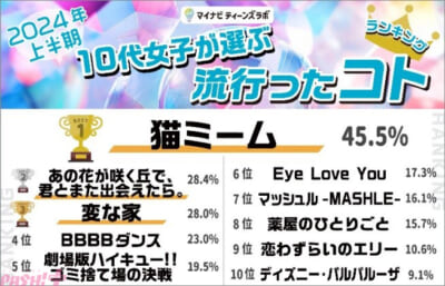 TikTokをはじめ、YouTubeやX上でも大流行した猫ミームが1位に。猫ミームとは、思わずクスッと笑ってしまうようなエピソードやあるあるネタを、猫の画像や動画を素材として、コメントやキャプションをつけて再編集した動画のこと。10代女子が口を揃えて「自分で動画を作ったりはしないけど、とにかくSNSでよく流れてきた」と回答していた。