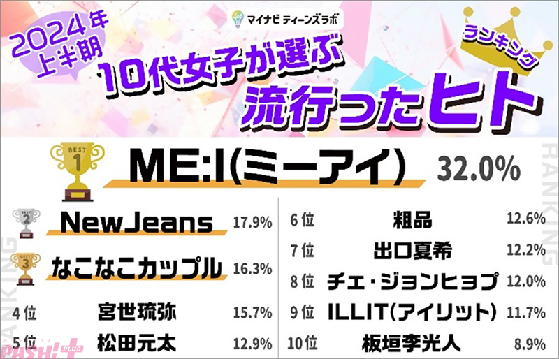 マイナビが運営する、ティーンのマーケティングやリサーチを行う「マイナビティーンズラボ」は、「2024年上半期 10代女子が選ぶトレンドランキング」を発表しました。本ランキングは、2024年上半期に流行した「ヒト・コト・モノ・コトバ・ウタ」の5ジャンルについて、13~19歳の女性682名にアンケート回答を集計したものです。
