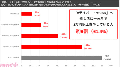 また、「VライバーやVTuber」を推している人の約6割(61.4%)がギフティング(投げ銭)に1万円以上を費やしており、「Vライバー・VTuber」市場の人気・盛り上がりは依然継続しているものと見ることができます。
