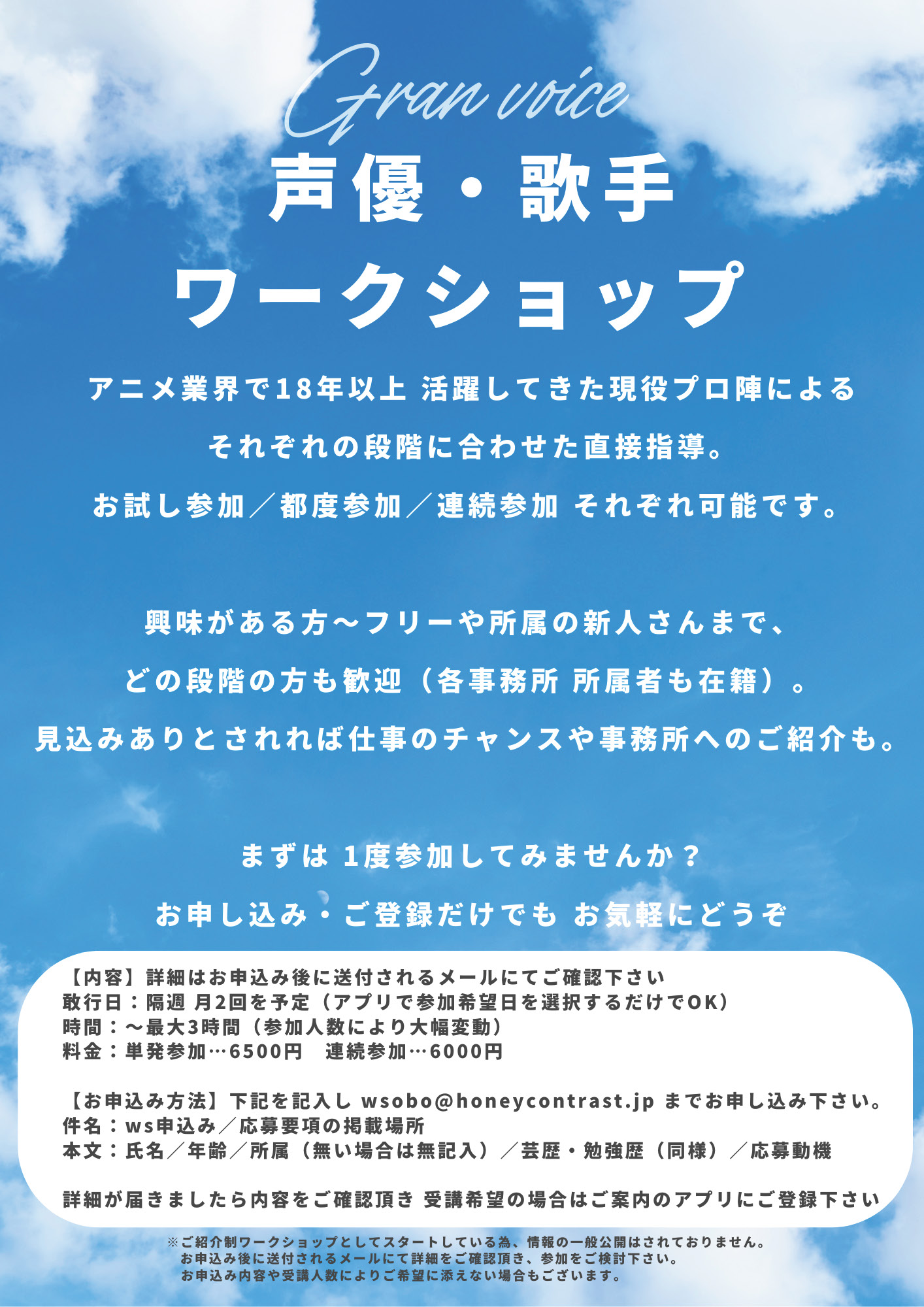 声優・歌手として18年以上の実績(アニメ・吹替・歌手)を持つ、現役プロ声優が講師を務める声優ワークショップ「グランボイス」が生徒を募集している。