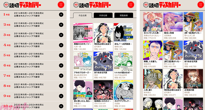 2014年9月~2024年8月末までに「少年ジャンプ+」初出で配信された読切を、1年ごとに「閲覧数順」「いいジャン率順」で20作品ずつ紹介します。