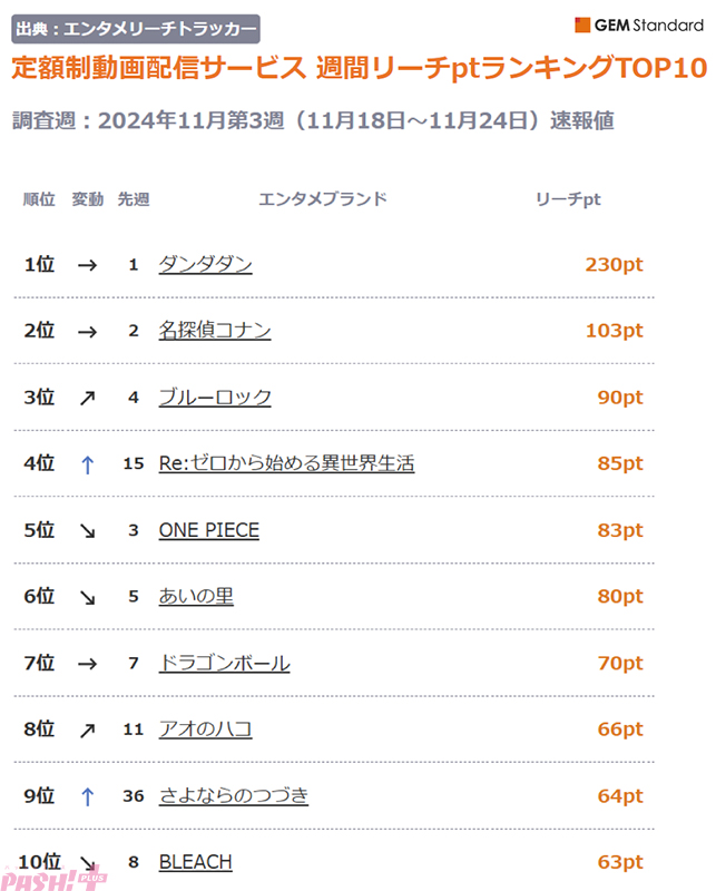 GEM Partnersは、複数の定額制動画配信サービスを横断集計した2024年11月第3週(11月18日~11月24日)の速報値のエンタメブランド別(※1)の週間リーチptランキングTOP10を発表しました。