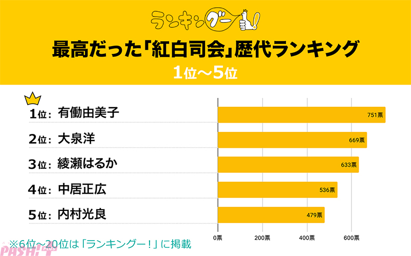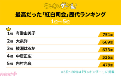 CMサイトが企画編集する、「ちょっと気になる」を調べたランキングサイト『ランキングー!』は、『最高だった「紅白司会」歴代ランキング』の結果を、投票者のコメント付きで紹介する記事として公開しました。