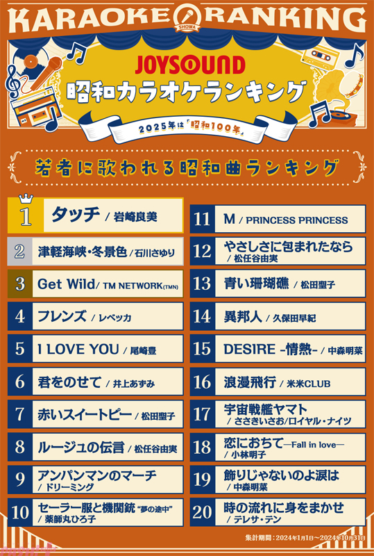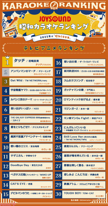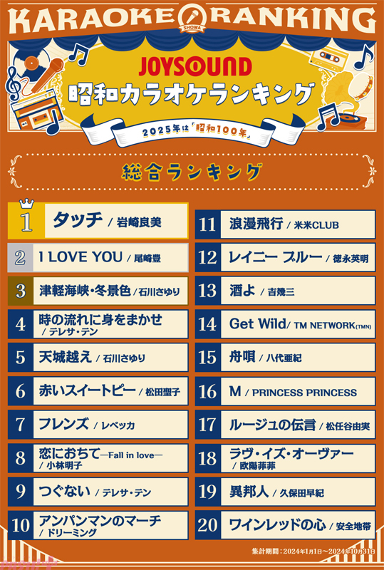 通信カラオケ「JOYSOUND」を展開するエクシングは、2025年に昭和元年から100年の「昭和100年」を迎えることを記念して、令和のいまもカラオケで愛され続ける昭和の名曲を「昭和カラオケランキング」として発表しました。