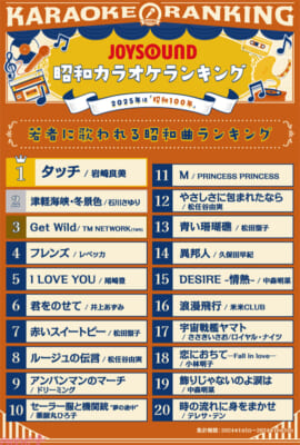「昭和100年」を迎える令和のいま、最も歌われている昭和曲は、1985年にリリースされたアニソンの名曲、岩崎良美さん『タッチ』! 続いて、尾崎豊さん『I LOVE YOU』が2位、演歌のトップを走り続けている石川さゆりさん『津軽海峡・冬景色』が3位と、カラオケ定番曲が上位を占める結果に!