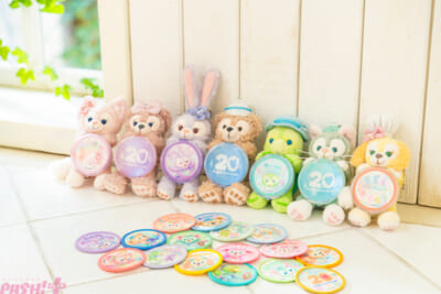 ダッフィー&フレンズ7人のぬいぐるみチャームは「20」と書かれたシャボン玉モチーフのケースを持っているデザインで、そのシャボン玉の中に、20周年オリジナルデザインのワッペンを入れることができます。