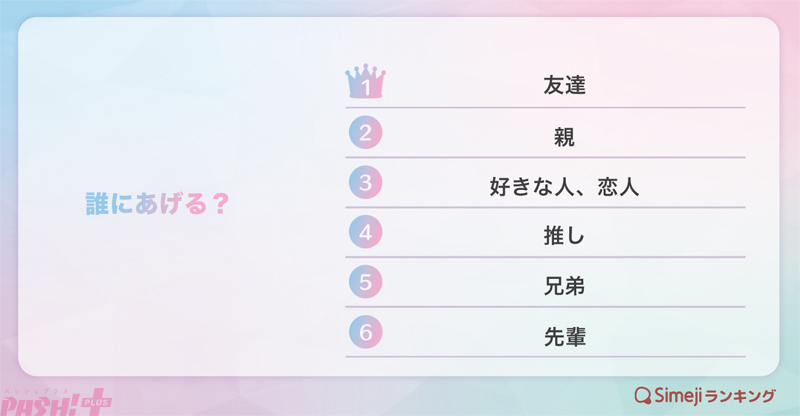 また、誰にあげるかの回答に対しては、「友達」が一番多く、次に「親」、「好きな人・恋人」と続いています。