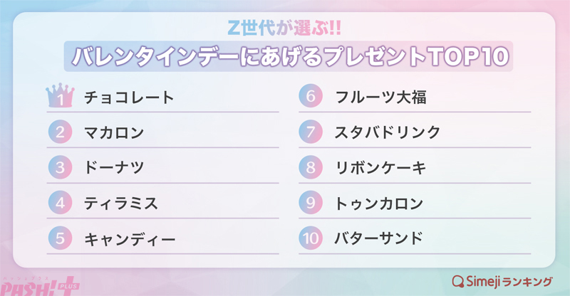 Z世代が選ぶ「バレンタインデーにあげるプレゼントTOP10」は多彩なスイーツにスタバのドリンクもランクイン! 「Simejiランキング」より調査結果が発表