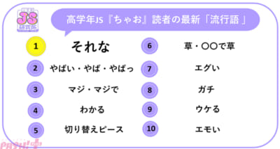 『JS流行語』1位は相槌言葉である「それな」。2位「やばい」、3位「わかる」、4位「マジ」と共感・驚きを端的に示す言葉が上位を独占