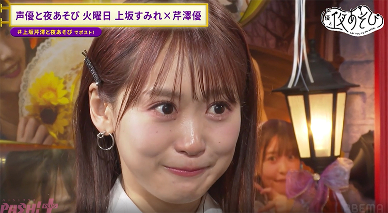 ここで、上坂さんよりサプライズが…。「アドリブが苦手だからお手紙を書いてきた」と口を開き、上坂さんは芹澤さんへの手紙を読み上げます。「『夜あそび』を通して、セリコのかわいいところ、頑張り屋さんなところ、たまにポンコツなところ、たくさんの素敵な一面を発揮できていつも嬉しい気持ちでいっぱいでした。いつでも手を抜かず、諦めないセリコは本当にすごいです。私はセリコのいいお友達になれたかな、美味しいもの食べに行こうね。これからもずっとずっと仲良くしてね」などと、感謝の気持ちを伝えていると芹澤さんは号泣。