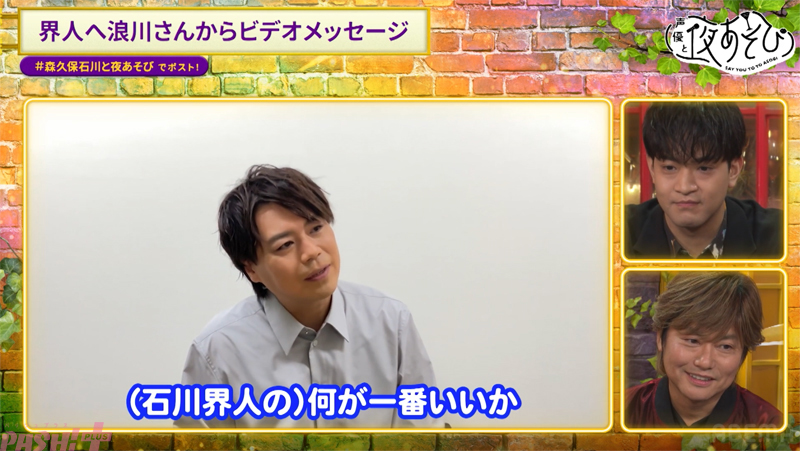 その後は石川さんが、夜あそびが築いたという浪川さんとの絆を語る場面も。実は夜あそびに出演する前はあまり親交がなかったそうで、「浪川さんもおっしゃっていたんですけど、コンビを組む前までは正直あまり印象が良くなかったみたいなんです」「20代前半は僕も超尖っていて、アニメで浪川さんとご一緒したとき、あまり親交がないのにラジオで急に弄ったりして、第一印象は『めっちゃ弄ってくるこだな~』だったみたいです」と明かした石川さんに、森久保さんも「そうだったんだ!」とびっくり。