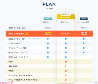 ライバー個別のファンクラブでは、限定コンテンツや、ライバーと交流することができる専用チャット、年3回の会報誌、会員証、カスタムスタンプなどを楽しめます。にじさんじ総合ファンクラブでは絵日記、ブログ、動画の限定コンテンツや専用チャット、アプリ版会員証などを楽しめます。さらに、イベントの先行抽選(ファンクラブ限定)に応募できます。なお、ファンクラブ会員限定イベントへの参加も可能です。