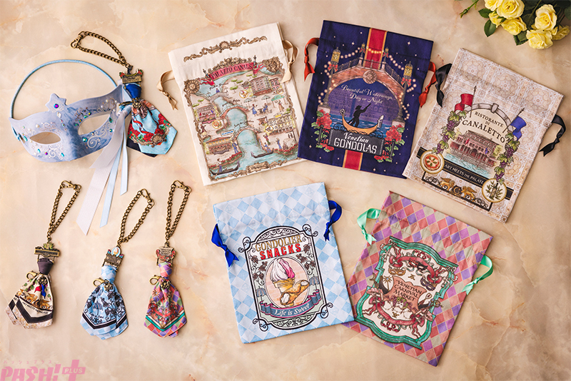 さらに、パラッツォ・カナルにある「ヴェネツィアン・ゴンドラ」や「リストランテ・ディ・カナレット」、また「ヴェネツィアン・カーニバル・マーケット」などの店舗装飾やモチーフなどがデザインされたバッグチャームやきんちゃくが登場します。それぞれ全5種類あり、どのデザインが出るかは開けてからのお楽しみです。なかでもバッグチャームは、カーニバルマスクをセットすることができ、バッグなどにつけて持ち歩くことができます。