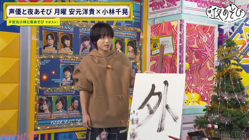 また、番組後半では「安元小林的!今年の漢字」を実施し、二人が「今年の漢字」を発表。その場で筆を執って小林が書いたのは「外」。その理由を「今年は人生で一番海外に行かせていただいたので」と語り、ハワイやLA、シンガポールの地名をあげて「同時に海外のファンの方と日本のファンの方々との違いを知ることができた年でした」と振り返りました。「夜あそびも外と言えば外なんで」と言いながら落ち着いた様子で席に戻った小林でしたが、「えっ…?」と安元も視聴者もその発言の意図がわからず困惑。真面目な表情でカメラをじっと見つめる小林に「顔で押し切るなよ」とツッコミを入れつつ、安元も自分の漢字の記入に立ち上がります。