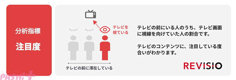 テレビの前にいる人(滞在者)のうち、テレビ画面に視線を向けていた人(注視者)の割合を表します。シーンに注目している度合いがわかります。