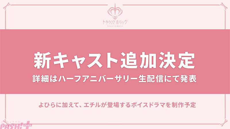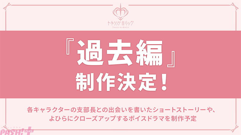 2026年2月1日に開催されたキャスト全員出演のリアルイベント「『Toxic-a-Holic』Fan Party Vol.2」にて『Toxic-a-Holic』“過去編”の制作決定を発表しました。過去編では各キャラクターと支部長の出会いを描いたショートストーリーや、よひらにクローズアップするボイスドラマを展開します。