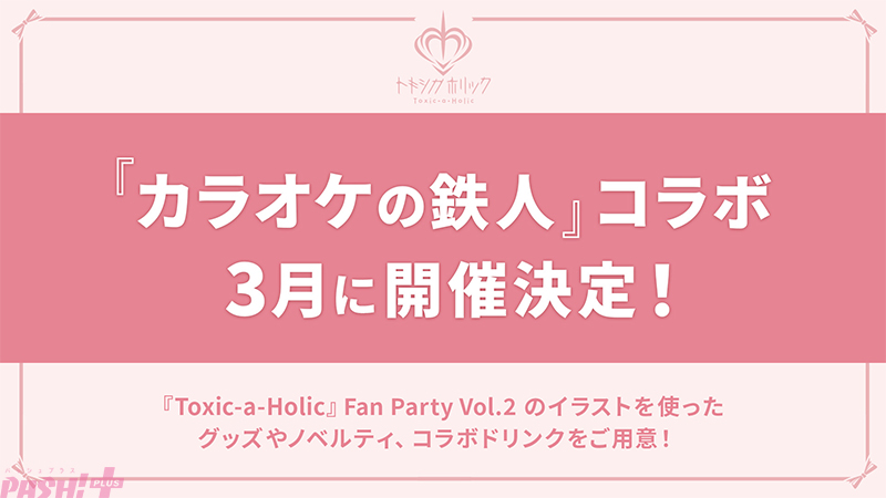 『Toxic-a-Holic』と「カラオケの鉄人」コラボが3月に開催決定しました。本イベントでは、「『Toxic-a-Holic』Fan Party vol.2」のキービジュアルを使用した新作グッズやノベルティ、コラボドリンクの発売を行います。詳細は後日発表します。