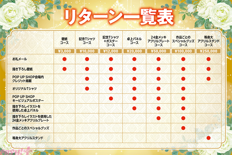1名限定の描き下ろし等身大アクリルスタンドをはじめ、オリジナルTシャツなど、ここでしか手に入らない超限定のリターン品を各種用意。デザインなどは公式Xなどで順次告知となります。