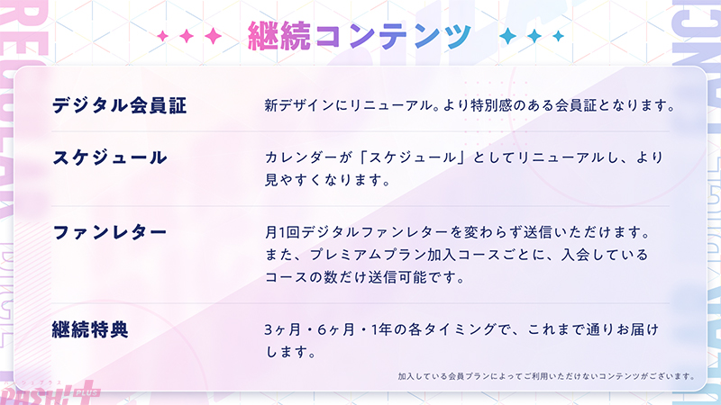 ファンクラブのリニューアルに伴いコンテンツの追加・廃止となるコンテンツがあります。